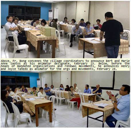 Fr. Bong explained that he really cannot Oind the time to regularly meet, guide, and advice the village coordinators and the orgs and movements as they plan their activities and projects in this Year of the Parish. Hence, he is ‘deputizing’ the Santoses and the Tañedos to act as ‘animators’. So last February 23, Fr. Bong once again introduced Bert and Marie Anne Santos in their new role to the village coordinators and the next night, February 24, he introduced Henry and Joyce Tañedo in their new role to the mandated organizations and renewal movements.